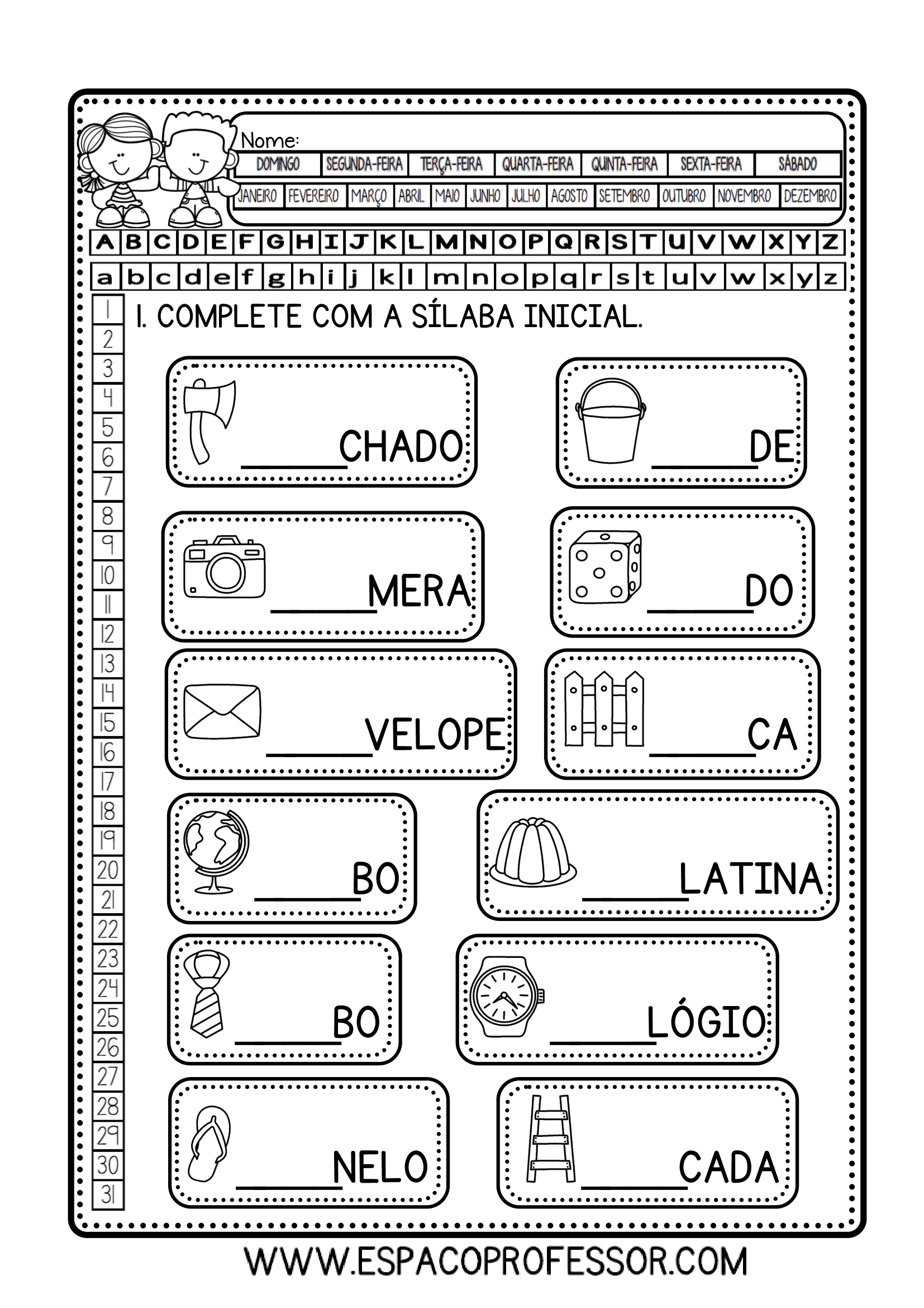 Arquivo com 3 páginas de Atividade de alfabetização, sílaba e leitura de palavras. Atividade de alfabetização com cabeçalho criativo com dia, mês e a fic...