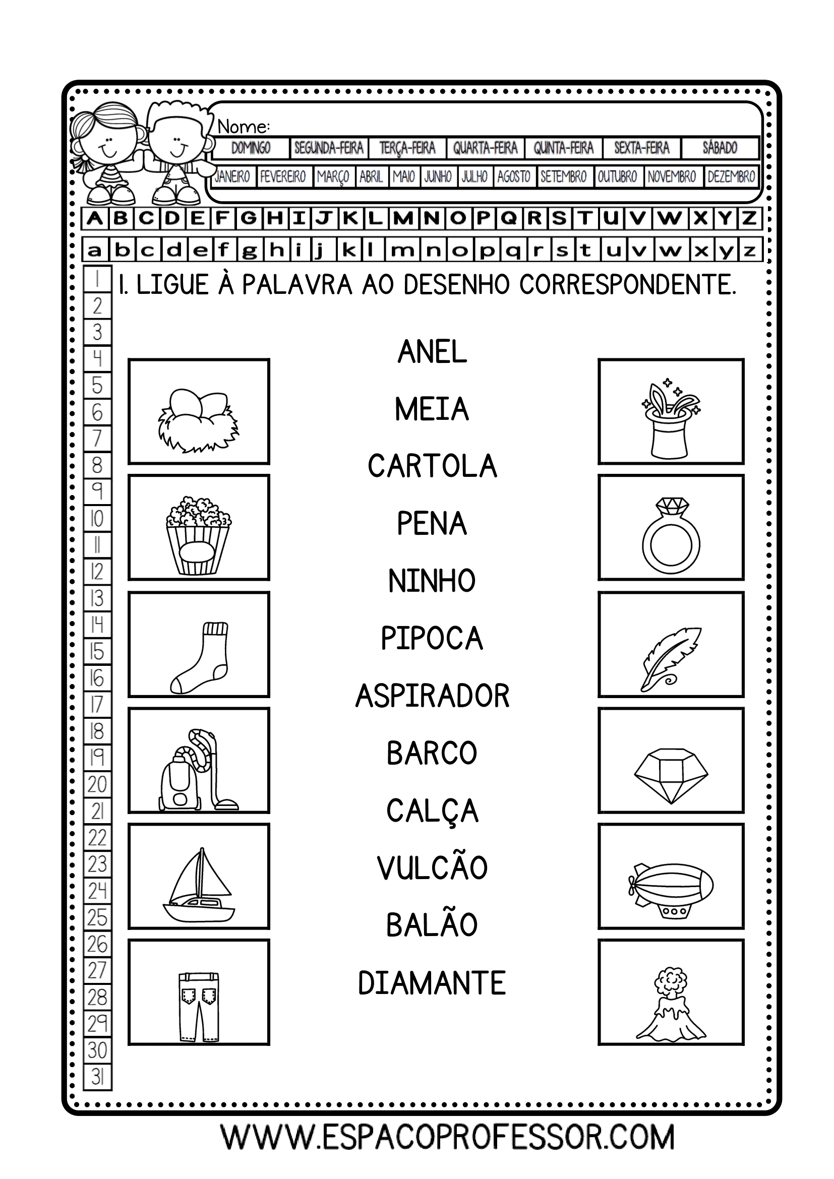 Arquivo com 3 páginas de Atividade de alfabetização, sílaba e leitura de palavras. Atividade de alfabetização com cabeçalho criativo com dia, mês e a ficha do alfabeto.