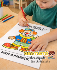 💡 Dica pedagógica: converse com as crianças sobre o circo, seus personagens e cores. Dá pra explorar linguagem oral junto com a atividade.