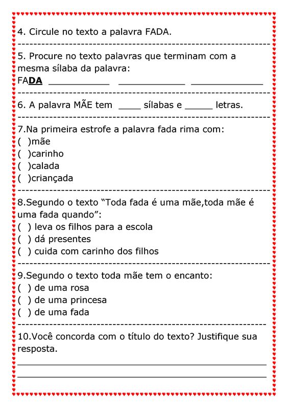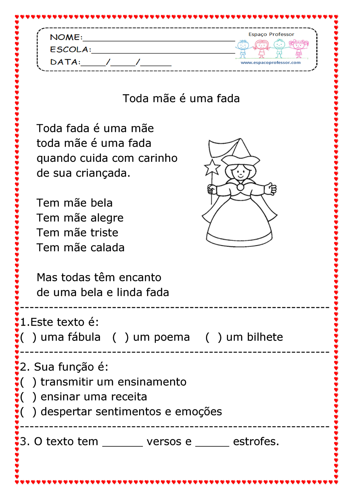 c) Apresente o poema “Toda mãe é uma fada” aos alunos, lendo-o em voz alta. Em seguida, distribua cópias do poema para cada aluno.