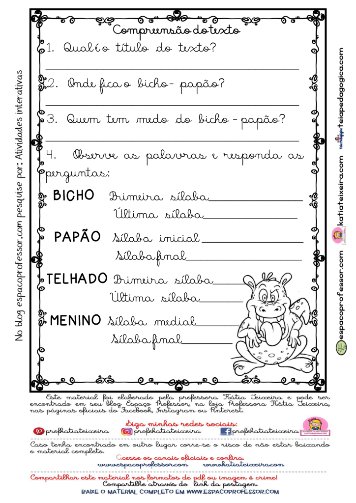 Leitura interativa bicho-papão letra cursiva – leitura e interpretação de texto