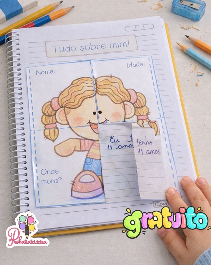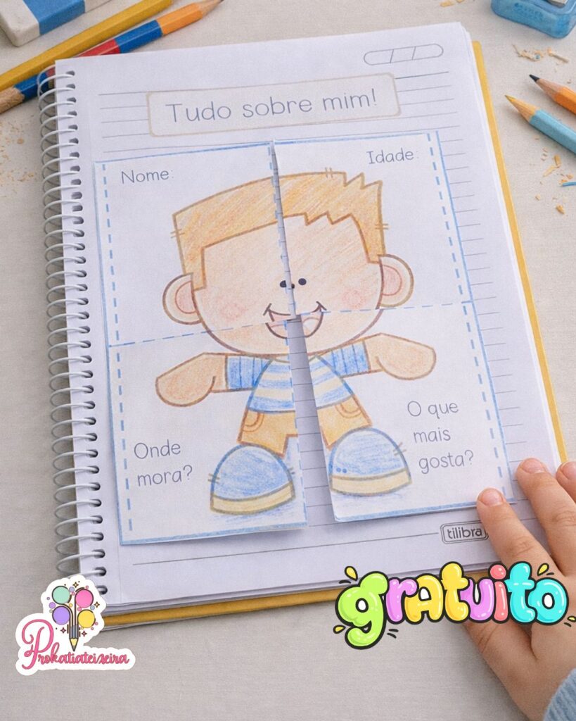 Por meio de um personagem simpático e divisões bem definidas, a criança é convidada a falar sobre si mesma, respondendo perguntas essenciais como nome, idade, onde mora e o que mais gosta. Parece simples — e é exatamente aí que mora a força da atividade.